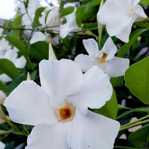 川沿いのお宅のフェンス 毎年綺麗なマンデビラ白を 咲かせます。