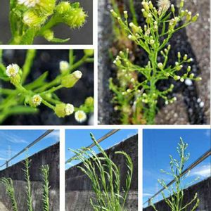 よく見かける雑草🌿 ホウキギク(箒菊) ーーーーーーーーー 🗒️特徴 草丈50cm~120cm 花径約5mm 全体無毛、硬い茎がよく分は枝する。 葉の数が少なく、茎ばかりが目立つ。