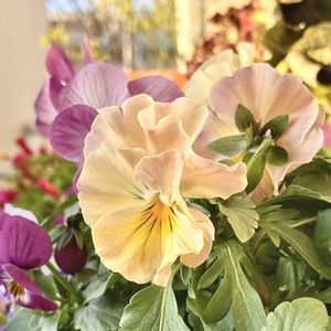 ビオラ 華あられさん💕 例年はパンビオが並び始める早い時期に出まわる花あられさんなのですが、今シーズンは中々出会えず😢 毎年お迎えしているメンバーの1人なのに今年は華あられさんなしかしら🤔と思っていましたが、年が明けた頃から見かけるように🌸 今更かしら😂などと考えお迎えしていませんでしたが、結局アンティークっぽい雰囲気のお花が好きで、はなかんざしさんと一緒にお迎えです さすが信頼の華あられさん、日に日に花数を増やしてくかわいくなっ てくれています💗 やはりお迎えして良かったです ╰(*´︶`*)╯♡