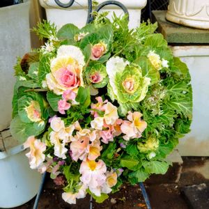 葉牡丹とビオラ華あられのハンキング🌿 年末にケース買いした色んな葉牡丹をふんだんに使用して制作しました。出来立てほやほやです😊 葉牡丹は真ん丸に制作しやすいので簡単にパパッと仕上げました🌿