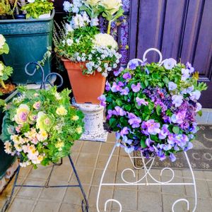 葉牡丹とビオラのハンキング🌿 出来立てほやほやを玄関前に並べて記念撮影🪴