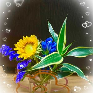 💐お花の定期便💐 🍀リンドウ 🍀スターチス 🍀ドラセナ 🍀ヒマワリ 💐お花のテーマ 『swimブーケ』💐 💐花言葉 ❤︎リンドウ 「誠実」「正義」 💙涼やかな雰囲気を演出し、空間に落ち着きと季節感を添えてくれる魅力的なお花です。 ❤︎ヒマワリ🌻 「あなただけを見つめる」 「憧れ」「情熱」 🌻「あなただけを見つめる」という花言葉はひまわりが成長する間、太陽の動きに合わせて花が一日中ずっと太陽の方を向いていることから来ています。 💐お花の定期便から🌻ヒマワリが届く続く三本目🌻✨ 💐お花のテーマはリンドウの中心としてですね。