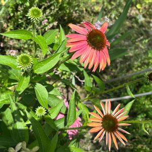 日当たりのいい場所からエキナセアが咲きはじめました。 種にしないように花殻をカットしているつもりでも、花数が多すぎるのでついつい種になってしまう💦 色んな色が交配して不思議な色合いの花が咲きだすのでこれはこれで面白いんですけどね😄 これは何となく赤とオレンジが混ざってそうですよね。 メルカリで買った種からスタートしたエキナセア、初めはピンクが多かったから、ピンクは抜きつつ、気に入った色だけ種にして蒔いてなんてしていたら、だんだんバランスが良くなってきました。 本格的にガーデニングをスタートした頃から育てているので愛着のあるお花の一つです。