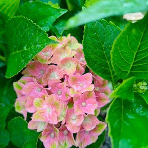 アジサイが葉っぱの間から可愛い花をのぞかせています この花は去年札幌花フェスタで購入したお花 今年は大株になっていっぱい花をつけています