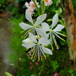 1枚目 🌼ガウラ🌼 白いガウラが咲きだしました。 モンシロチョウみたいです。 向こう側に、背の低いピンクのガウラがあります。 奥に見えるのは、種まきから育てたダリア で、今では太もものような(😂)球根になりました。 2枚目🌼ピエールドロンサールの二番花🌼 二番花、こんな花だっけ?って感じです🤭