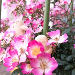 大好きな土地の名前に惹かれて お迎えしたバラ『安曇野』 細かいトゲがびっしり生える つるバラでした😅 それでもバラ園でよく ハート型に仕立てられたりして 小花がびっしり咲く可愛いバラです😃 我が家では最後に見頃を迎えました😊 ハニちゃんと一緒に😃 🏷ハニワの日 参加します🤗🎶