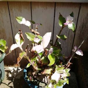 『ハツユキツユクサ』(初雪露草) ツユクサ科 トラディスカンティア属 葉に赤紫の斑が入るのが特徴。 別名 ハツカンセツ コチョウノマイ TOKO さんに教えて頂きました。