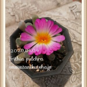 夏型メセンのフリチア“光玉” 個人的には、同じ種属の菊光玉や冬型メセンのフェネストラリア(群玉や五十鈴玉、朱鈴玉)より育てやすいかな…と思っています。 そんな光玉の小株に蕾がひとつ。 7月下旬に大株が花盛りで、今年はこれで終わりかなぁ~と思っていたので、時間差で開花が見られるのは予想外で嬉しいです。