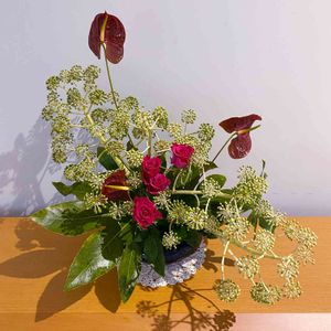 梅の花が膨らみ始めました。 梅は和の花ですが、枝が直線的だったので、洋のバラ・トルコキキョウとカスミソウを合わせて洋風に仕上げたつもりです。