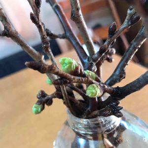 屋根に被さる部分を 旦那が切ったのが1ヶ月前 ツボミが沢山付いてるから 可哀想で保護した桜 だいぶん育ってきたよ❗ 水だけで(笑) 暖かい日は日向ぼっこ