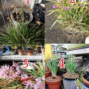 ツルバキア 開花 更新記録の 様子 一番は 花が完全に枯れています 2番は かろうじて残っています 3番は まだまだ更新中 4番 花が終わったもの 株分けしました♪