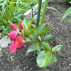 昨年末、学校花壇の隅に植えてあったマンデビラ サンパラソル。冬越しは難しい(防寒対策なし)と思ってましたが、見事、再び花が咲きました😍枯れたように見えたけど、根っこは生きてたんですね!