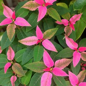 サントリー プリンセチア ロゼマーブル💚🤍💗 オペラ♥️ 10/3から始めた短日処理、オペラの方は50日目10/21で終了しましたが、ロゼマーブルは色づきがイマイチだったので、引き続き短日処理していました📦 ̖́- ロゼマーブルの短日処理も今日で2ヶ月経ち、去年程の華やかさではないけど、ここらで終了しようと思います♡*゜ ❤︎ 1枚目…ロゼマーブル挿し木1年目5号鉢 ❤︎ 2枚目…ロゼマーブル親株2年目6号鉢 8月の突風で転がり、枝数が3割減りました。 ❤︎ 3枚目…優しい彩りが広がって可愛いです(,,>᎑<,,)*•.❥* ❤︎ 4~5枚目…今日のオペラ 左が挿し木5年目8号鉢 右が挿し木1年目6号鉢、4枚目にも登場!! 真っ赤な苞がボリューム出てきました⋆⸜♥️⸝⋆