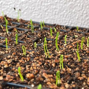 Brahea armata(トゲハクセンヤシ) 日本でも非常に人気が出て普及してきた種類ですが、掌状葉の出揃った大きな苗は依然として高値で取引されている状況です。 その理由は成長の遅さにあると思います。発芽後暫くは単葉が続き、本葉になり観賞価値が出てくるまで数年はかかります。 発芽率自体は悪くないのでしょうが、発芽に要する時間は種によってかなりばらつきがあるみたいです。1ヶ月ほどで出るものもあれば2年以上かかるものもあるとか。 あまりにも動きがないからと庭に捨てた後、忘れた頃に大量に発芽していて驚いたという話も聞きます。 一度低温に晒すとスイッチが入るという情報もありますが真偽は不明です。 ヤシ袋1つにつき20粒位ずつ蒔いていますがなかなか減りません。 注文しすぎたか?😅