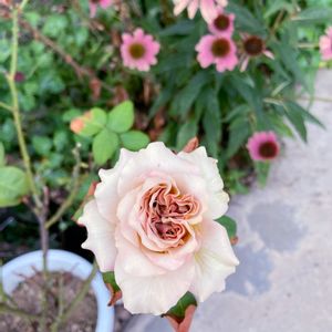 リベンジ新苗のカフェラテ。 蕾のピンチを繰り返してもなかなか枝数が増えないのでいいや!とばかりに咲かせてしまいました。 花色がうっす〜い😅