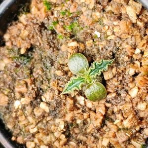 小さい上に用土と似た色なのでわかり 難いですが真ん中にいます。 1号鉢からプレステラ75へ植え替えた時に 塊根部をみましたが、小さいながら 塊根が出来てました。