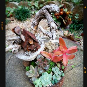 昨日、お片づけしながら火祭りしか入ってなかったjyunkarrowさんのメルヘンな鉢に寄せ植え🍀 ポイポイプランターから取り出した子を寄せました(≧∀≦)💕 だから大和姫ちゃんブツブツが💦 でもサビサヒな器にぴったり~って無理矢理思ってます(^◇^;) 流木の先にヘクソカズラの実を飾ってみました💞 でも、多肉さん入るとやっぱりかっこいいな~この鉢✨
