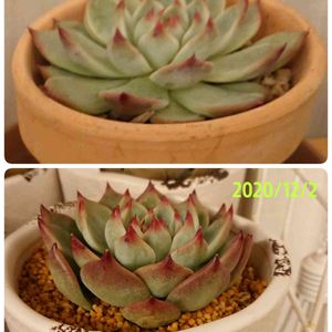桃太郎さん😊 こんばんは😃🌃 桃太郎さん、お迎えした11月初めは、素焼きの鉢も大き過ぎたってのもありますが、パッカーンと開いてました。 リエールさんの多肉さん達を植え替えついでに桃太郎さんも鹿沼土に植え替えしたら… 何ということでしょう‼️ 違いが分かりますか? 鹿沼土さん、君凄いよ✨✨✨ ここまで変わるなんて~😆