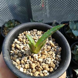 【アガベ チタノタ バリエガータ(錦)】 この間グランカクタスで買ったやつの子株です😃 ほんとはまだ付けときたかったんですが植え替えのときに外れてしまったので植え付けました😥 無事大きくなってくれると良いのですが😣