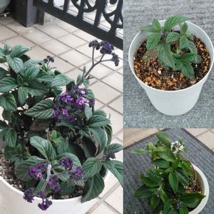 おはようございます。 何度か投稿しております。 ヘリオトロープ💜💞 冬支度の為✂️した↖️お花は瓶にさして(お花が汚なくなっちゃたわね😓) ↗️元の株=💜 ↙️さし芽の株💜 ⬇️白いヘリオトロープ🤍 ↘️寒さの中で頑張っている姫ツルソバ ヘリオトロープ💜 上手く冬越ししてね🙏