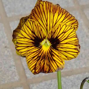 🐯タイガーアイ🐯 こちらのスゴイ模様のビオラはタイガーアイさん🐯ガォ〜〜! 模様のパターンに幅があるそうですが、うちの子は毎回ガッツリ模様が出ています🐯当たりでした❣️ でも投稿すると色が褪せる気がします。もっと黄色いのに😣 我が家に来て2ヶ月。休みなくずっと咲いています。結構早くからモリモリになって良い子です😍 園芸店で「ちょっと変わったのを買っちゃう。タイガーアイとか。」と言うと「それは個性強過ぎ😆」と言われてしまいました😅 個性強すぎて、寄せ植えが難しいんですよね〜。 🐼スミレに続き、🐯アイ、後1つ動物シリーズあります😁