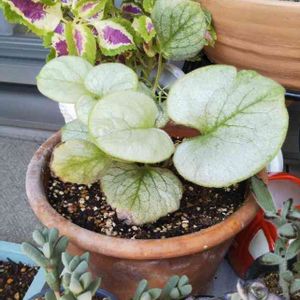 水道のフタを隠すため、鉢置いてみました!!ブルンネラジャックフロストと ホスタオーガストムーン投入です(≧∀≦)✨ アドバイスいただき ありがとうございます✨ そのうち、鉢の前にウエルカムプレート置いてみたいです! しかし、、想像以上に派手!! 葉っぱの見本市のようですが、玄関先で大声で挨拶してるようなパワフルな花壇になりました((o(^∇^)o)) 『いってらっしゃーい!!』 『おかえりー!!』 手を振って挨拶する元気花壇の完成です!