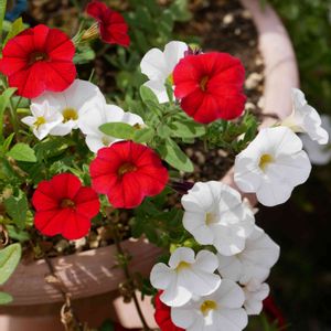 長く咲き続けている、可愛い紅白のカリブラコア。 ナス科カリブラコア属。 ペチュニアをそのまま小さく華奢にしたような感じですが、家では寄せ植えの鉢から垂れる様に咲いています。 ハッキリした赤と白で、可愛いお花です。 お花が小さいので花がらを摘むのが少々やりづらいですが、とっても長い間咲き続けている優秀なお花です😉 寄せ植えの鉢が高さはあるものの、鉢自体の深さが浅いので、成長して根っこが一部見えてきてしまっているのが気になります💦 ナス科なので、連作は良くないようですが、花数が少なくなったら、切り戻すつもりです。秋にも綺麗に咲くようです。