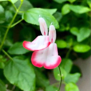 1つの蕾から2つのお花が咲いている紅白のチェリーセージ❁¨̮ 花びらの先端が少しだけ赤い感じが また可愛い(∩´∀`∩)💕