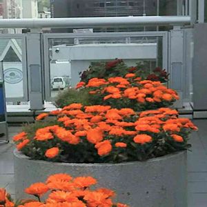 小田原駅のお花のディスプレイ🌼 小田原城を入れたかったがボケボケ😓 お花は実際もっと黄色っぽいオレンジです‼😅💦