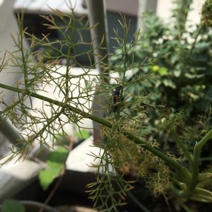 フェンネル(職場で捨てられる予定だった株)に、アブラムシが出て来たなーって思ってたら、テントウムシの幼虫がやって来た。ムシャムシャしてる⁉️🐞