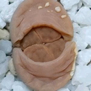 ①琥珀玉1号くん 😱ムンクの叫びみたい ②2/25の1号くん 😱この頃は ちょいグロめ👻 ③琥珀玉2号くん しなやかに脱皮中~✨ ●自分用メモφ(・ω・`)● リトープス属『琥珀玉』 別名: リトープス・カラスモンタナ (L.karasmontana ssp. bella) 自生地: ナミビア南部アウスからウィトプッツ(Witputz)にかけての一帯 色 : 緑・黄系 シルバー・白系 赤・ピンク系 茶・黒系 花色:白花 特徴 : 「琥珀玉」は、頂面が丸く膨隆し、ハート型になる中型のリトープス。 「花紋玉」に似ていますが、くっきりと入る窓の枝模様が特徴。 秋には白色の花を咲かせます。 分頭し、最多で50頭を越える大株になることも。