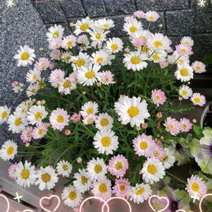おはようございます マーガレット.スマッシュ 今年初めに作った寄せ植えの中の1つ 大きくなったので別鉢にした ずっと咲いていて夏はやや少なめだったけど寒くなったら蕾が沢山出てきた 夏までは黄色の花🌼が多かったのに今はピンク色🌸が沢山 しばらく楽しめそう😊 有難いお花ですね❤️