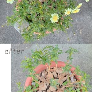 2度目の満開を過ぎてそろそろ剪定せねばと思っていたボンザマーガレット 先週の豪雨でボロボロに… ようやく剪定する気になりました 古株はだいぶ木質化してきているので超強剪定して若返りにチャレンジ この春仲間入りしたボンザマーガレットも一緒にサッパリ 夏越し準備万端です