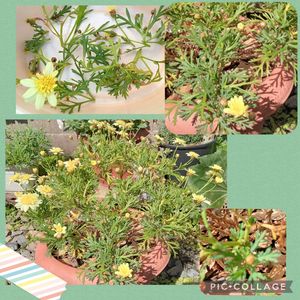 サントリーフラワーズ ボンザマーガレット レモンイエロー 2年目のボンザマーガレットさん💛 下葉が枯れてスカスカになってしまったけどお花はたくさん咲いてきました(*・v・) 毎晩、室内に入れていたけどそろそろ大丈夫かな😊