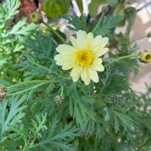 おはようございます☂️ 昨日のボンザマーガレット レモンイエロー🍋さん 先月切り戻ししてお花をつけて くれてますが‥前に比べて気のせいか 花が小さい‥💦栄養不足かなぁ‥