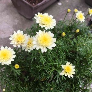 2年目のボンザマーガレットのレモンイエロー☺️🌸 1ヶ月位この状態で長くお花を楽しませてもらってます😆💓もう少しまんまるにしてあげたいな🥰