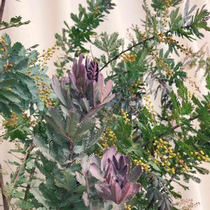*アカシアプルプレア* アカシア(ミモザ)でも葉っぱがパープルの部分が有るのプルプレア💜 グリーンからパープルにグラデーションが見られるようになります。 親友のお家に大きなアカシアがあり、年に一度お花が咲くプレゼントしてもらうのですが✨🌿コロナ禍なのでスワッグにして 車で3時間かけて持ってきくれました。 (4月のお話です⑅◡̈*) そんなミモザのスワッグがいい感じになってるので今のうちに撮影を😊💛 玄関にはアカシアのリースとアレンジメント、リビングにスワッグを飾ってます✨ モリモリなのでアカシアオンリー🤫