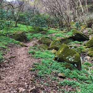 花の筑波山シリーズ🎶 出だしの山道はこんな感じ。 緑は全部ニリンソウの葉っぱ🌿ですが、まだ蕾というより、朝で日も当たってないので開いてないと言った方がいいのかも…
