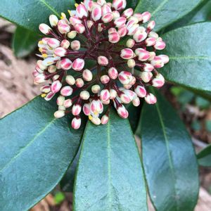 花の筑波山シリーズ🎶 この可愛いのは、ミヤマシキミのツボミです😍 赤いのは外側の萼片ですが、花柄、花序軸も赤いので、アケボノミヤマシキミと呼ぶ花になるかもしれません(変種、品種扱い。分けない説もある )