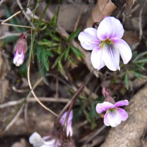 トウゴクサバノオがあった😊 とっても小さいんですが、これは果実が面白い😲 二個がVまたはT字型につながって、魚の尾びれに見えることから、サバノオです😆