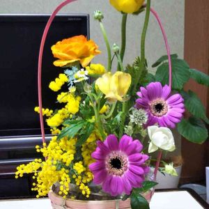 今月の主人の フラワーアレンジメントです💞 アカシア💛 ガーベラ💜 ラナンキュラス🧡 初めての名無しのお花🌼3種類 春らしくなりました💖