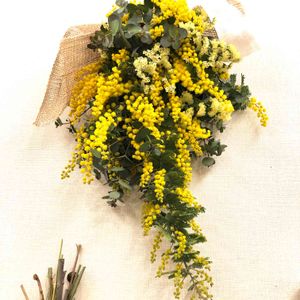 フレッシュミモザの枝ぶりを生かし たっぷり使ったスワッグ 幅広のジュートと白のリネンで束ねました