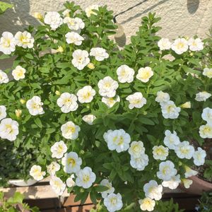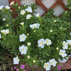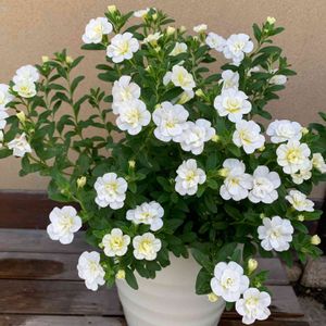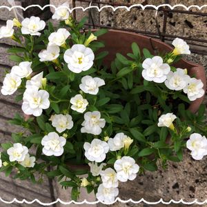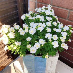 スーパーベル ダブルミルクレープ🌼 何気にこの子初登場かも🫢 最初にお迎えした子は根がグラグラで千切れてしまったので😭、もう一度お迎えしました‼️ 何度か切り戻して、何かに葉っぱをやられつつ、やっとこんな感じで花数も少しずつ増えてきました😊 やっぱり白は清楚で美しいです💖 ほんのりイエロー?な中心部がまたよいのです♪