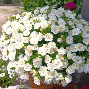 ①5年目のスーパーベル ダブルミルクレープ 挿し芽から一株でモリモリ🤍 親株さんは⭐️になりましたが 保険株で助かりました🙏 ②スーパーベナ アイストゥインクル こちらも挿し芽でどんどん 増えてくれます🤍💜 先祖帰り?の白花も可愛いです😊