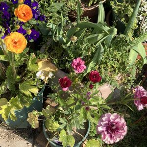 2023年春からのミネルバと今年仲間入りのティーバ。ミネルバは冬の間に4つに株分けしました。ティーバが色合いが変わっていくのがきれいです。ドライにすると赤が抜けて青っぽい紫になりました。 2枚目3枚目は購入した花苗。