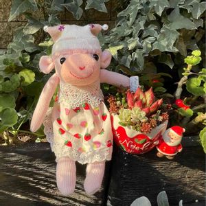 🏷毎月15日はいちごの日 🍓参加します❣️ 45さんを介してお迎えした、まつぴよさん作のソク🐵ちゃん😊 可愛い🍓柄のお洋服(≧∇≦) 横の寄植えも、昨年まつぴよさんから頂いた、レッドスーパークローン(コロン)を🎅🏻カップに寄せて1年経ったもの😆