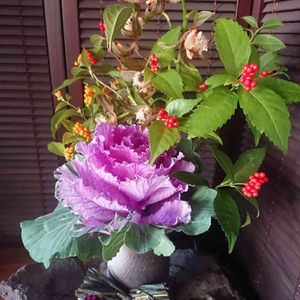 庭先より〜 花材 * 千両 * 黄実千両 * 蘭・シンビジウム 『葉牡丹』…頂き物 投げ入れ➰盛り花です💜