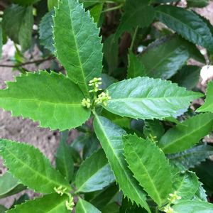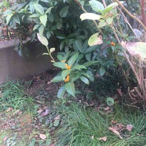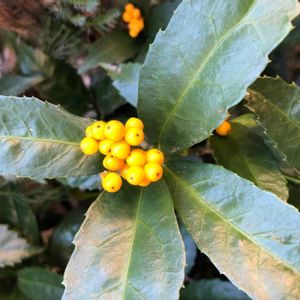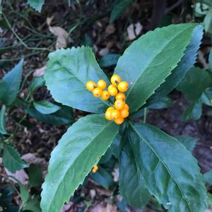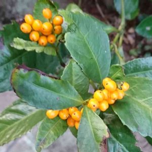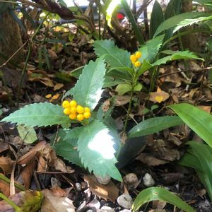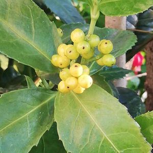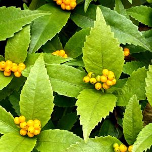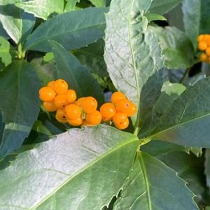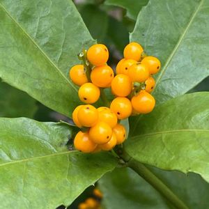 キミノセンリョウ 黄色💛から少しオレンジ🧡になってきたみたい😆 センリョウの果実の黄色くなる品種。葉は対生。葉身は長さ10〜15cm、幅4〜6cmの長楕円形〜卵状楕円形。先はとがり、ふちには鋭い鋸歯がある。花は両性。枝先に小さな花が集まってつく。花には花弁も萼もなく、子房の横に雄しべが1個つく。果実は核果。