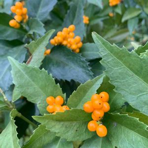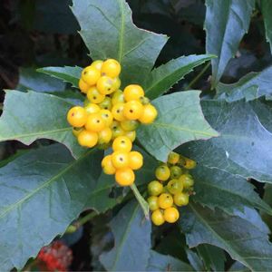 ヒイラギモクセイの葉っぱに似ている⁇ この実は何の実ですか? どなたかお助けを🙏 教えて頂き 「キミノセンリョウ」と分かりました。