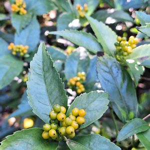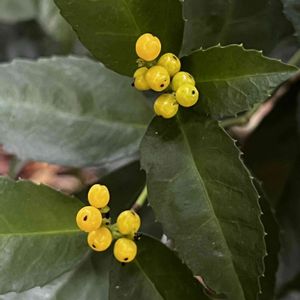 公園を散歩中に可愛い実を発見💡 黄色い実がキラキラと輝いて素敵〜😘 「ヒイラギナンテン」かなぁと思いましたが、「キミノセンリョウ(黄実の千両)」のようですネ!😚 花びらがなく、1本の雄しべと1個の雌しべだけがある変わり者🥹 実の色は、赤、黄、オレンジ、白など色々ありますよぉ〜